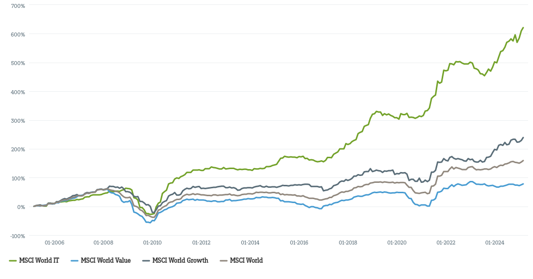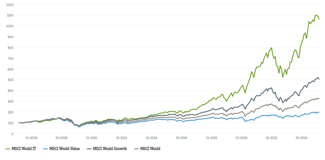 Quelle: DWS International GmbH, Refinitiv, Stand: Februar 2025; Der MSCI World Index ist ein globaler Aktienindex, der die Wertentwicklung von etwa 1.500 großen und mittelgroßen Unternehmen aus mehr als entwickelten Ländern abbildet. Der MSCI World Value Index erfasst Wertpapiere großer und mittlerer Unternehmen der Industrieländer, die insgesamt Value-Stil-Merkmale aufweisen. Der MSCI World Growth Index erfasst Wertpapiere großer und mittlerer Unternehmen der Industrieländer, die insgesamt Growth-Stil-Merkmale aufweisen.