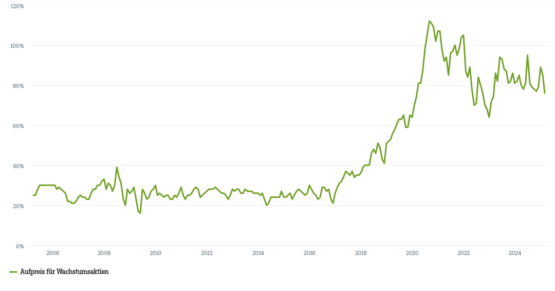 Die deutliche Bewertungsausweitung bei Wachstumswerten hat zu einer historisch hohen Prämie gegenüber Value-Aktien geführt.