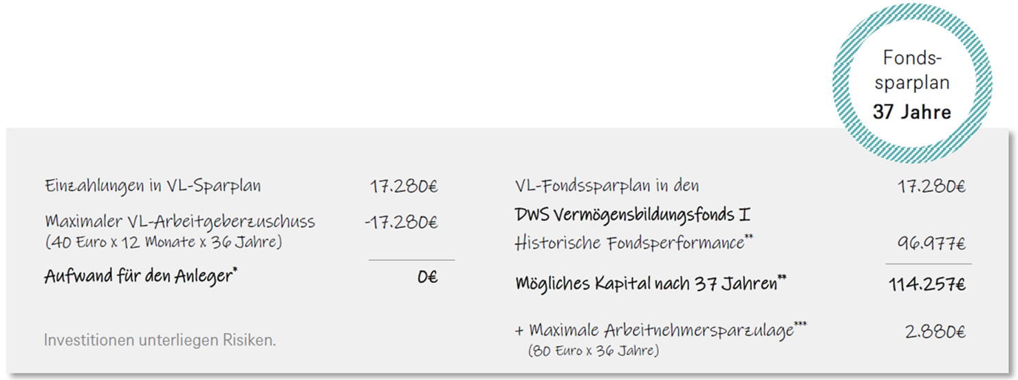 * Es fällt ggf. ein Aufwand für die Versteuerung des geldwerten Vorteils des Arbeitgeberzuschusses sowie Sozialabgaben an. ** Wertentwicklung der Vergangenheit, simuliert oder tatsächlich realisiert, sind kein verlässlicher Indikator für die künftige Wertentwicklung. Das Kapital bei Auszahlung ist nicht garantiert. Die Berechnung basiert auf vergangenen, realen Kurswerten (durchschnittl. jährliche Wertentwicklung 8,5%) zum 30.06.2025 nach Kosten (Ausgabeaufschlag 5%). Weitere Kosten können auf Anlegerebene anfallen (z.B. Depotkosten). Annahme: Der maximale VL-Arbeitgeberzuschuss von 40€ pro Monat werden über einen Zeitraum von 36 Jahren in den DWS Vermögensbildungsfonds I LD angelegt. Im 37. Jahr ruht der VL-Fondsspar-plan für ein Jahr bis zur Auszahlung. *** Die Arbeitnehmersparzulage wird während der Vertragslaufzeit in den VL-Fondssparplan eingezahlt. Zur verein-fachten Darstellung ist die Arbeitnehmersparzulage in diese Berechnung nicht eingeflossen.