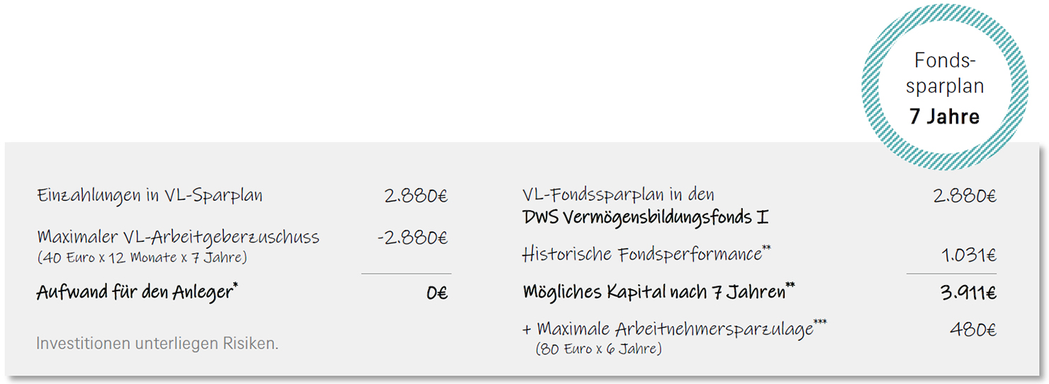 * Es fällt ggf. ein Aufwand für die Versteuerung des geldwerten Vorteils des Arbeitgeberzuschusses sowie Sozialabgaben an. ** Wertentwicklung der Vergangenheit, simuliert oder tatsächlich realisiert, sind kein verlässlicher Indikator für die künftige Wertentwicklung. Das Kapital bei Auszahlung ist nicht garantiert. Die Berechnung basiert auf vergangenen, realen Kurswerten (durchschnittlich jährliche Wertentwicklung 7,3%) zum 30.06.2025 nach Kosten (Ausgabeaufschlag 5%). Weitere Kosten können auf Anlegerebene anfallen (z.B. Depotkosten). Annahme: Der maximale VL-Arbeitgeberzuschuss von 40€ pro Monat werden über einen Zeitraum von 6 Jahren in den DWS Vermögensbildungsfonds I LD angelegt. *** Die Arbeitnehmersparzulage wird während der Vertragslaufzeit in den VL-Fondssparplan eingezahlt. Zur vereinfachten Darstellung ist die Arbeitnehmersparzulage in diese Berechnung nicht eingeflossen.